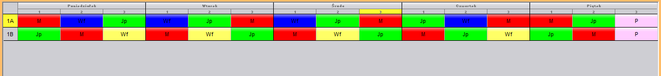 Może jednak wystąpić sytuacja, w której np. nauczyciel wychowania fizycznego w klasie 1A nie będzie mógł uczyć w poniedziałki, a nauczyciel wychowania fizycznego w klasie 1B w piątki. Dodanie tej zależności powoduje, że plan lekcji może zostać wygenerowany tylko wówczas, gdy w jednym dniu realizowane będą dwie lekcje z tego samego przedmiotu (w przypadku zilustrowanym poniżej jest to matematyka).