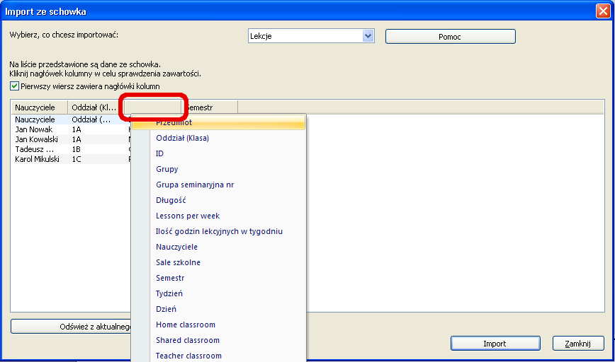3. Z listy rozwijanej wybierz Lekcje, a poniżej zaznacz opcję "Pierwszy wiesz zawiera nagłówki kolumn". Jeśli nagłówki kolumn w pliku Excela są dokładnie takie same jak nazwy kolumn w programie (np. "Nauczyciele" czy "Oddział (Klasa)"), to nagłówki wklejanych danych powinny zostać uzupełnione automatycznie.