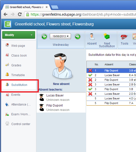 Online substitution is part of the EduPage. You can create EduPage for your school directly from aSc TimeTables: