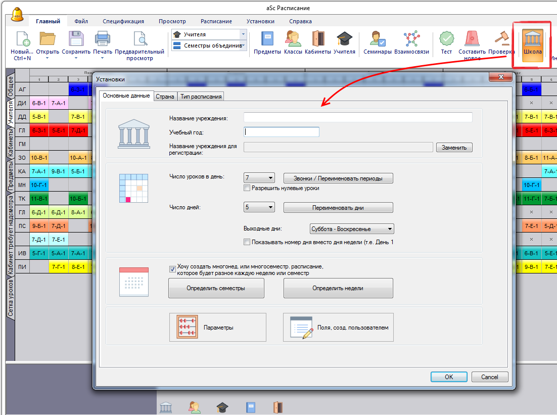 6. В этом же окне можно ввести времена звонков, поля, созданные пользователем и изменить названия дней недели.