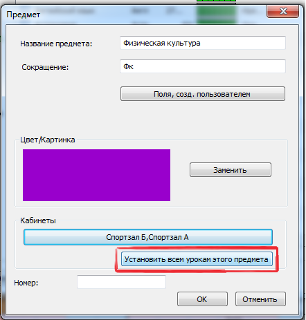 Так можно заменить или добавить кабинеты для уроков, которые уже введены в программу.