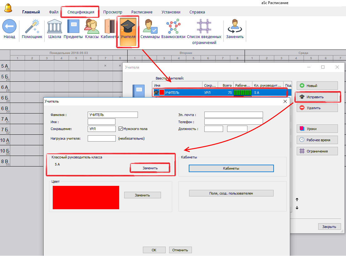 Примечание: классные руководители используются главным образом в программе "aSc Замены" и в распечатках, их имена печатаются в правом верхнем углу расписания класса.
