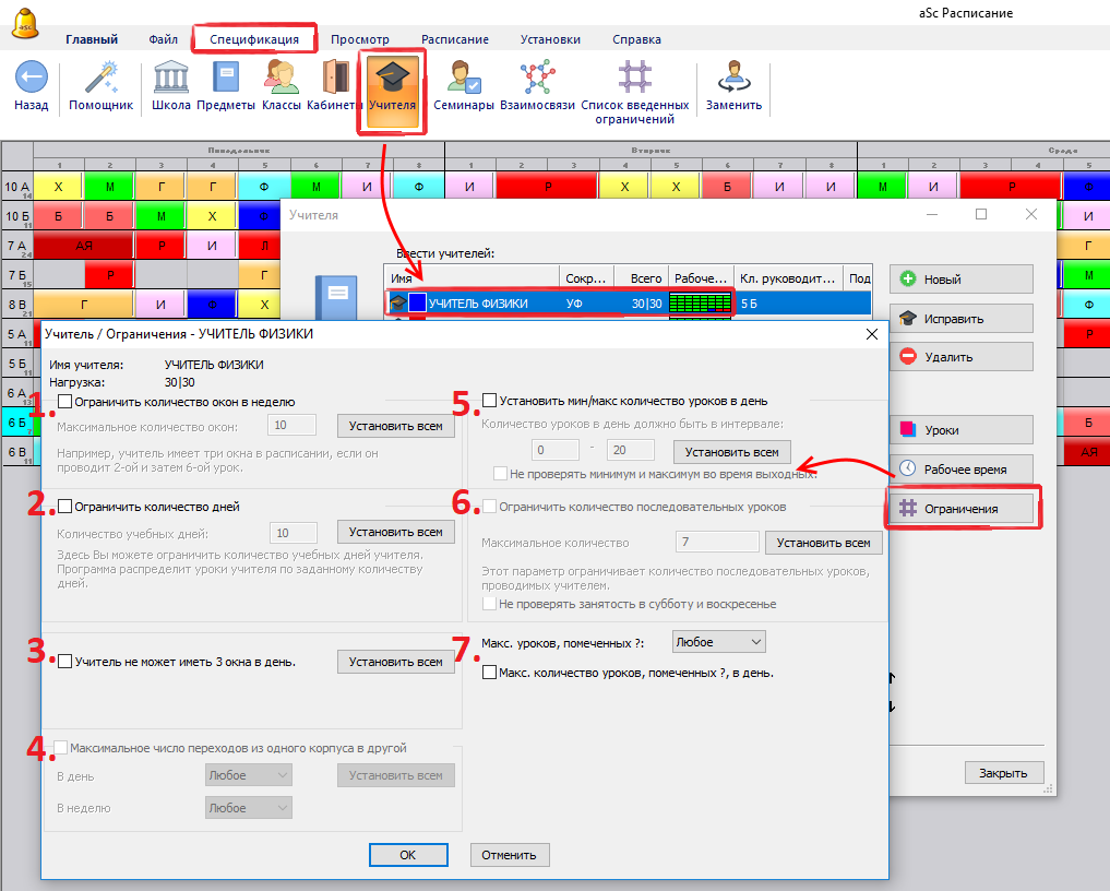 5. Установить минимальное / максимальное число уроков в день. Смотрите: Как определить мин и мах число уроков для учителя в день?