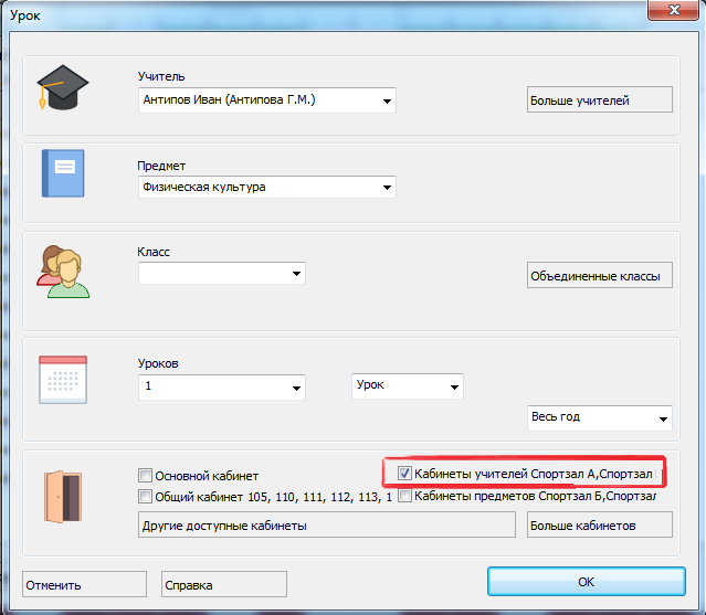 Примечание: если предмет имеет собственный кабинет (или кабинеты), тогда этому кабинету отдается предпочтение, а кабинет учителя не принимается во внимание.
