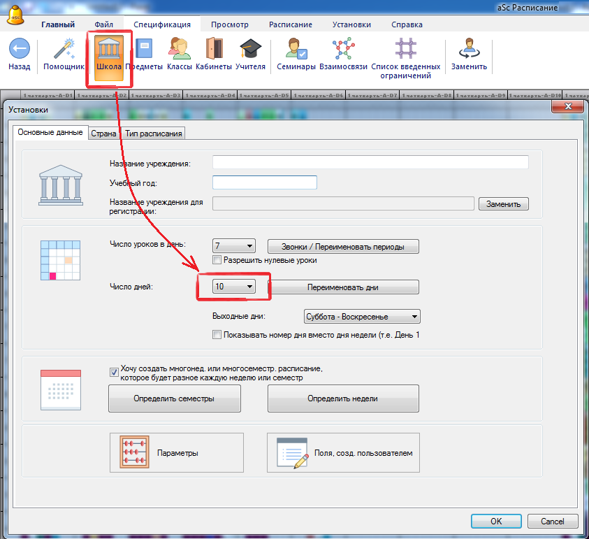 Если установили 10 дней - две недели по 5 дней, в таком случае Вы должны ввести удвоенные нагрузки, то есть, если учитель имеет 5 уроков математики в неделю, Вы должны ввести ему 10 уроков для расписания на 10 дней.