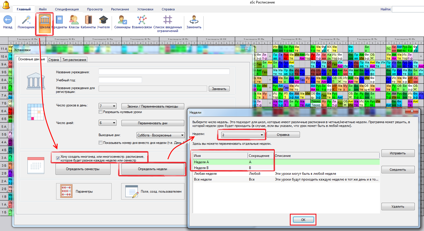Если Ваша школа имеет различные расписания на четных и нечетных неделях, можете указать, что есть две или больше недель: