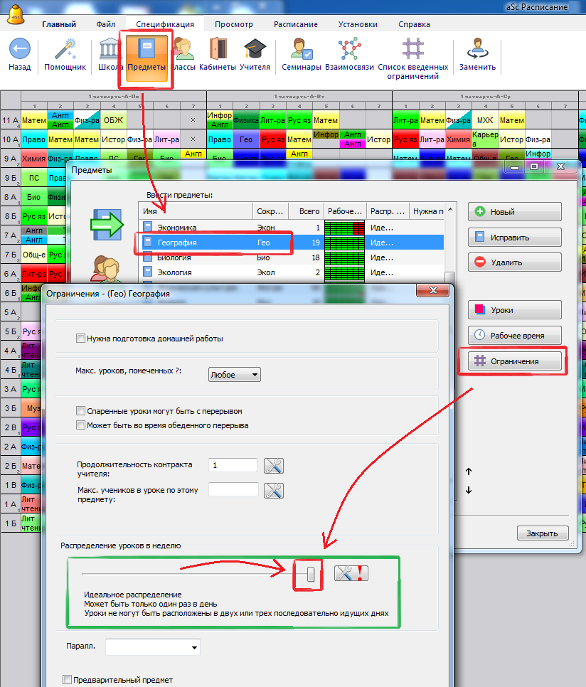 Выберите географию в списке предметов и нажмите кнопку "Ограничения".