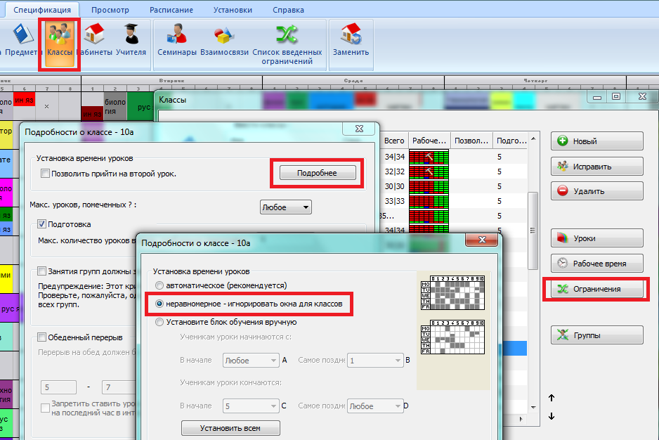 По умолчанию программа пробует создать расписание, в котором у каждого класса занятия начинаются с 1-го урока. Программа также вычисляет среднее число уроков в день и пробует уравновесить их в течение недели.
