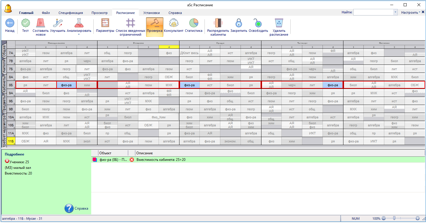 При составлении расписания, программа будет учитывать вместимость кабинетов, а также предупредит вас, если вы поместили большой класс в маленький кабинет: