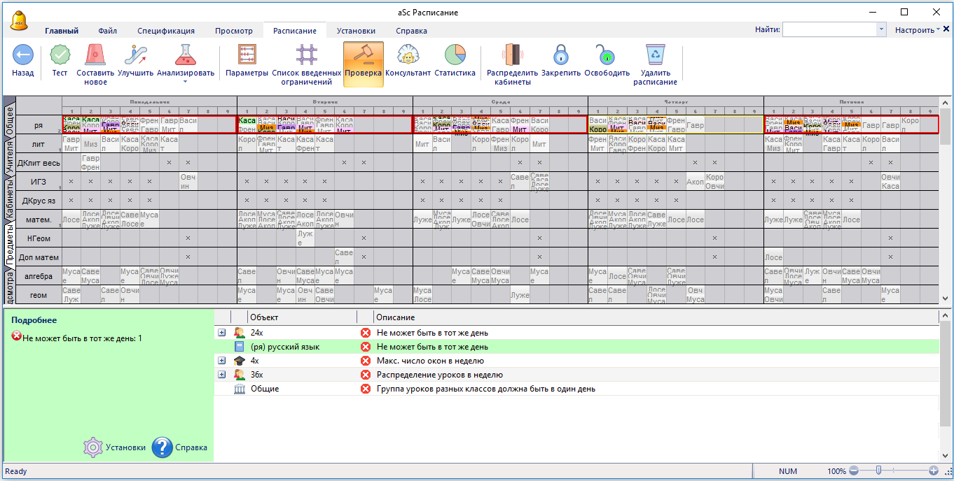В программе aSc Расписания есть возможность проверки составленного расписания. Это помогает выяснить, соответствует ли Ваше расписание заданным критериям, какие ограничения были не выполнены или облегчены. Вы можете запустить проверку расписания командой "Проверка" из меню "Расписание" или нажав клавишу пробела.