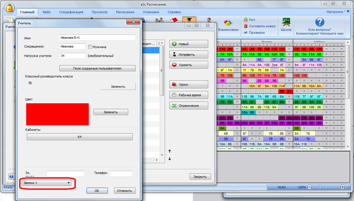 В программе возможно указать для каждого учителя его / ее времена звонков, а они будут печататься: