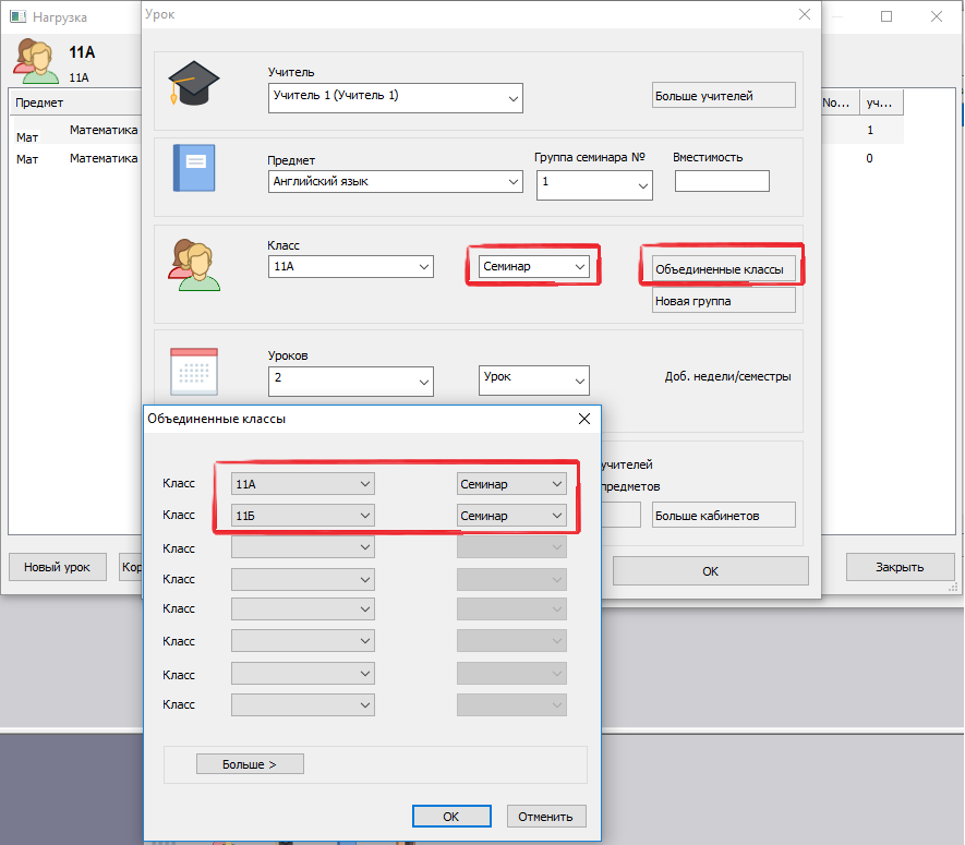 Например, следующая картинка определяет что есть два урока семинара по информатике. Один может посещать ученики из 11A, другой - из 11А/11Б. Потом можно определить, какие именно ученики посещают который урок, или программа их распределит автоматически (в версий Про - во время составления расписания):