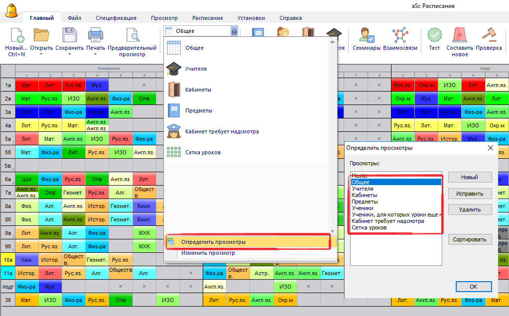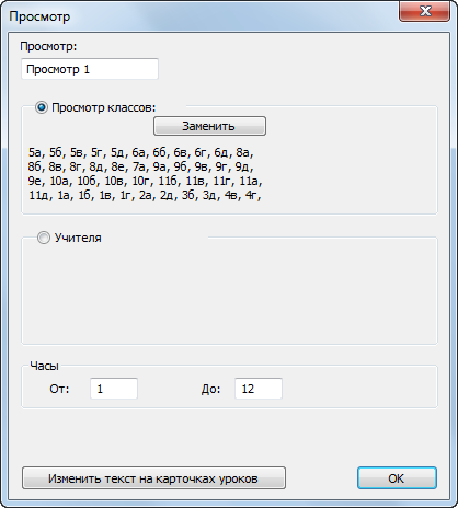 Просмотры позволят Вам делить расписания на более маленькие и легче читаемые части. Если имеется большое количество классов и все они не помещаются на экране, Вы можете отображать их по частям. Обратите внимание, что это касается только просмотра, а расписание сохраняется целым.
