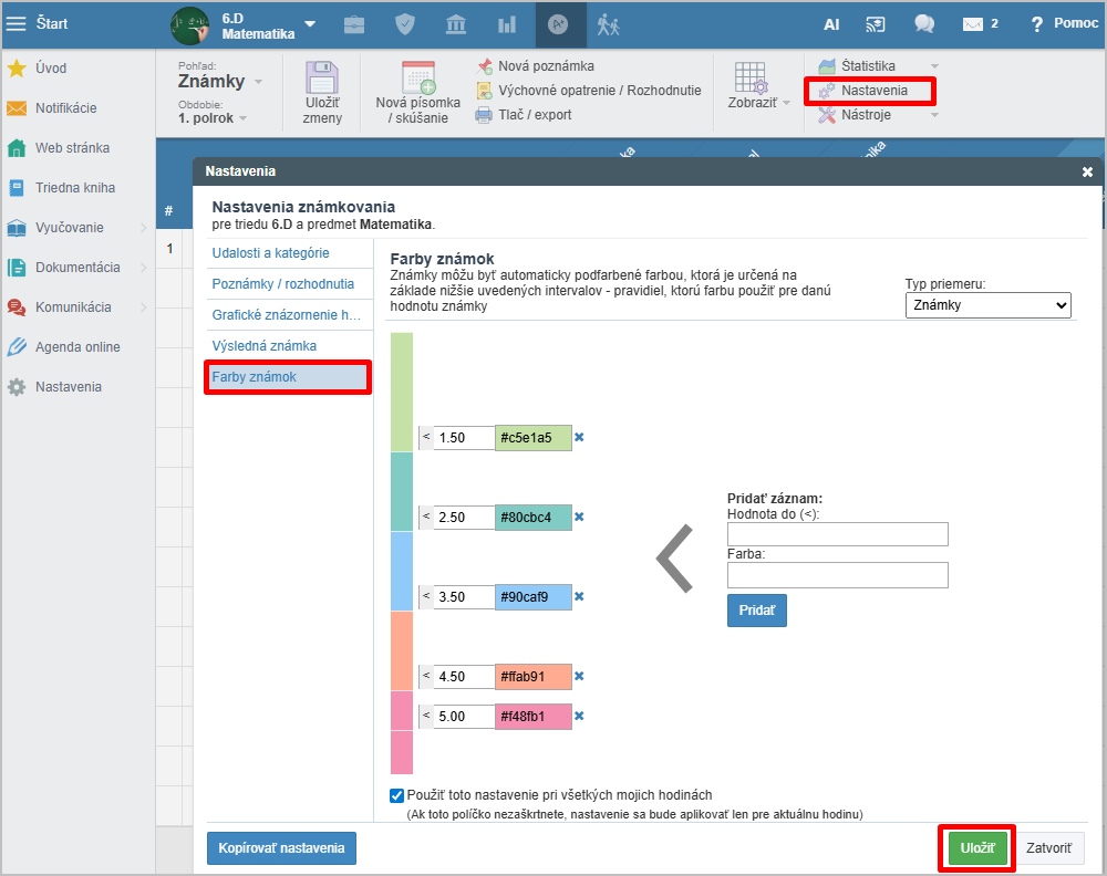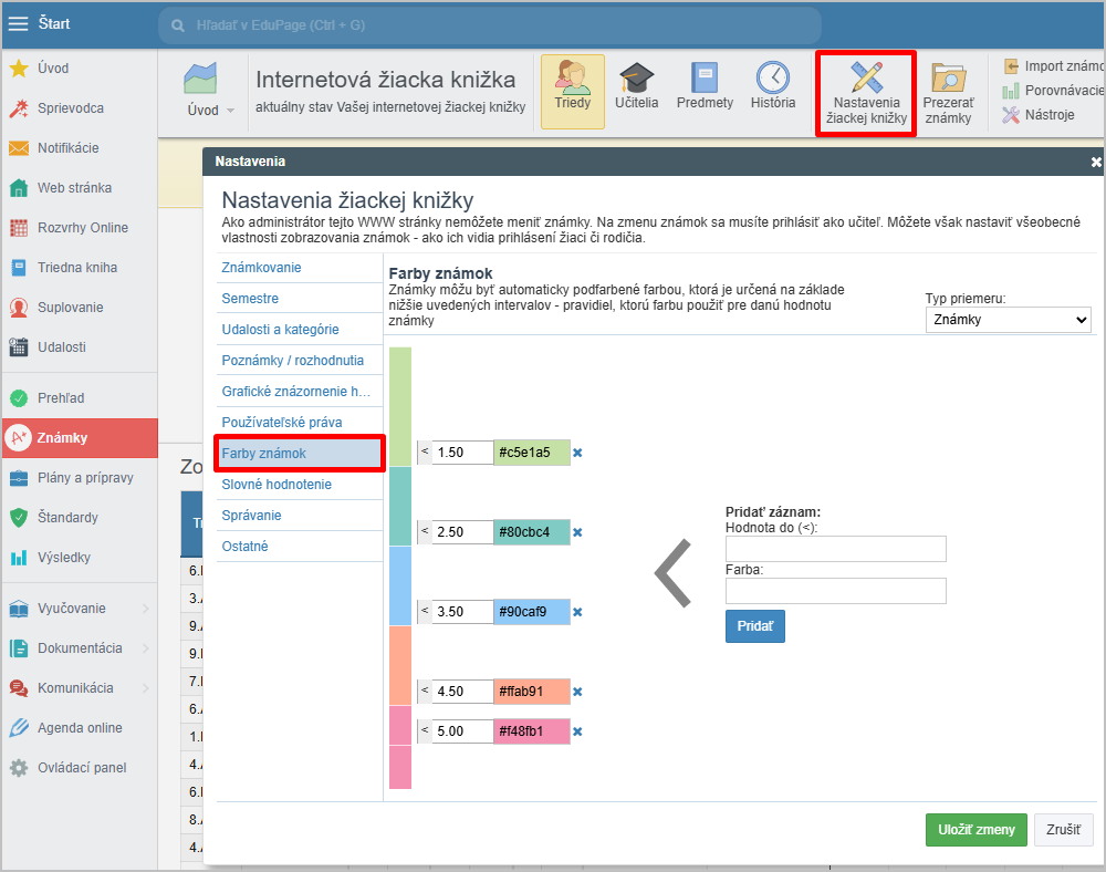 Farby tiež môže nastaviť administrátor centrálne pre celú školu. Pokiaľ má iné farby nastavené administrátor a iné učiteľ, nastavenia učiteľa majú vyššiu prioritu.