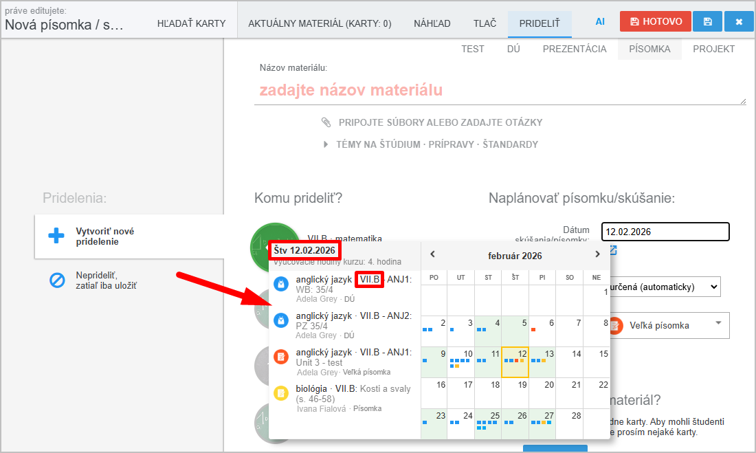 Plánovanie písomiek môže robiť učiteľ cez Štart a Naplánovať písomku/skúšanie.