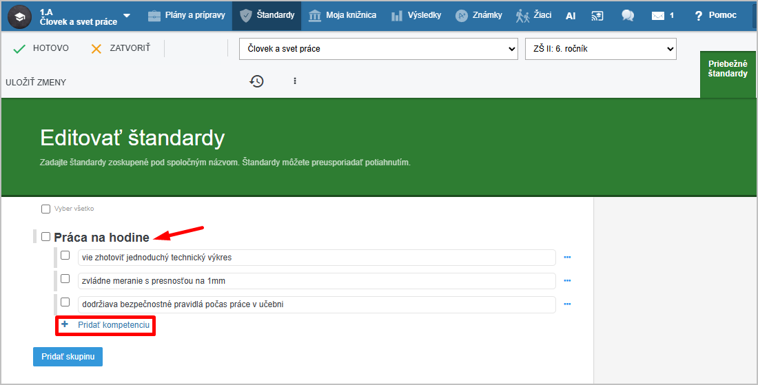 Zadajte názov skupiny a jednotlivé štandardy. Nový štandard pridáte tlačidlom Pridať kompetenciu.