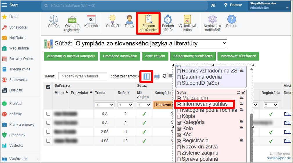 V module Súťaže cez Zoznam súťažiacich kliknite na ikonu Uvádzať stĺpce a pridajte si do tohto pohľadu stĺpec Informovaný súhlas: