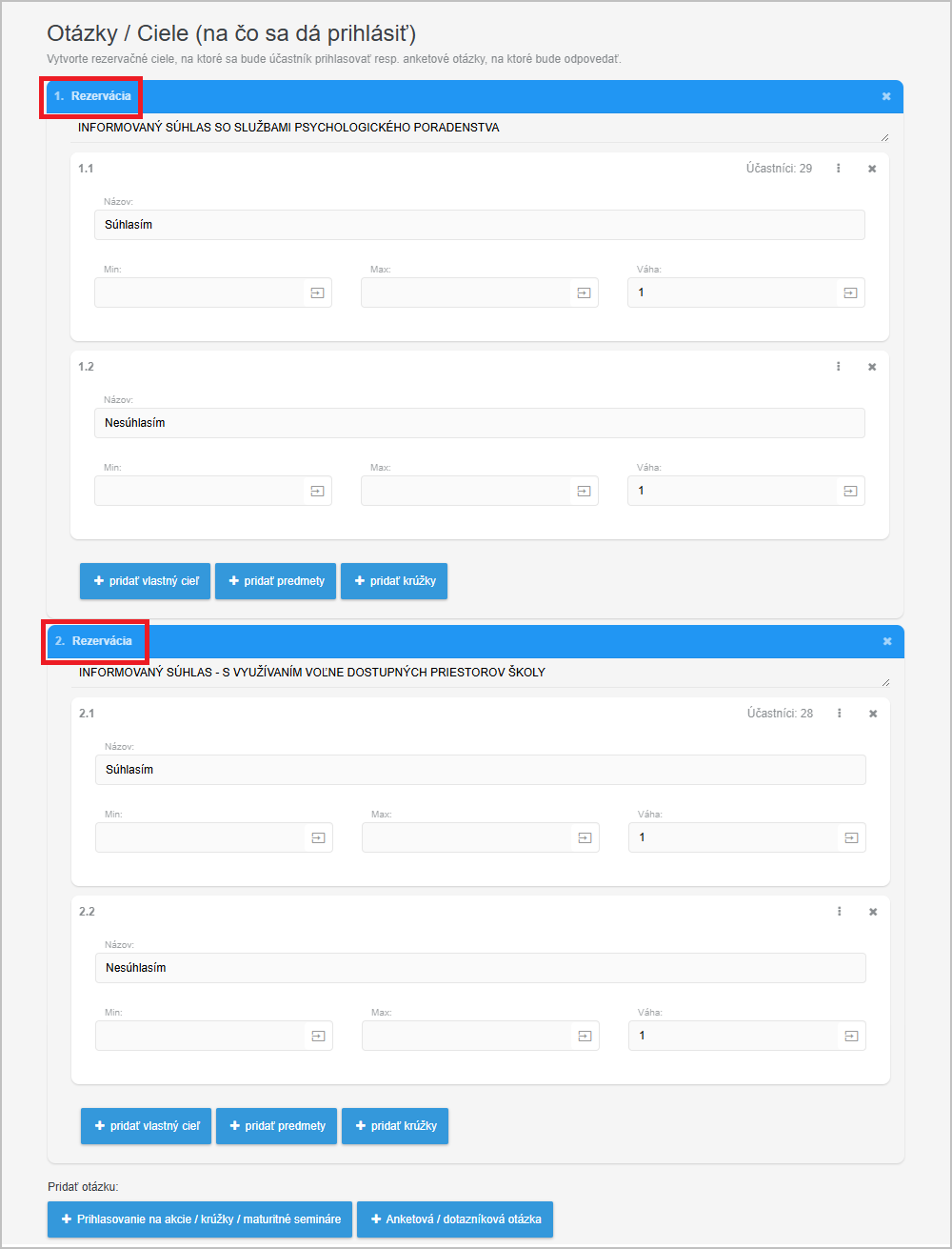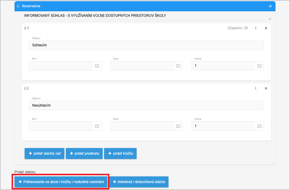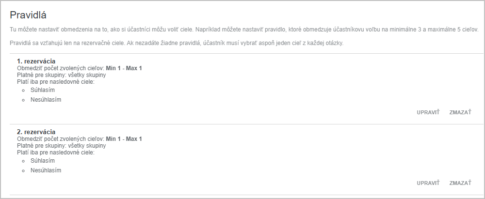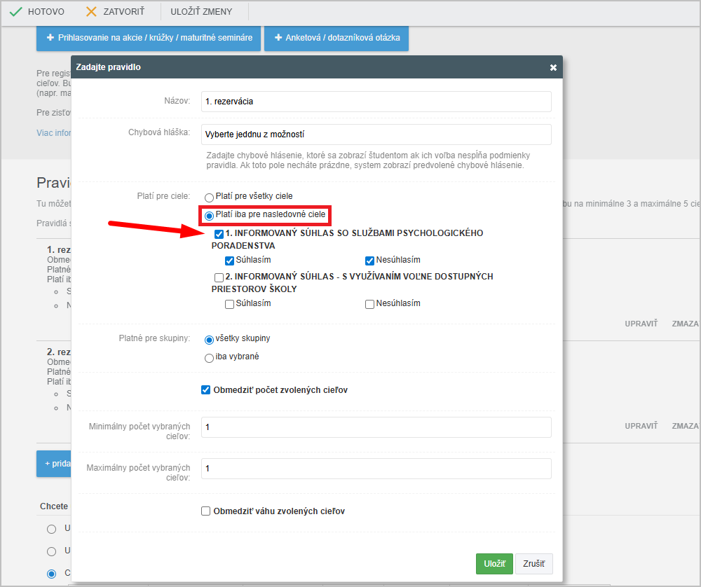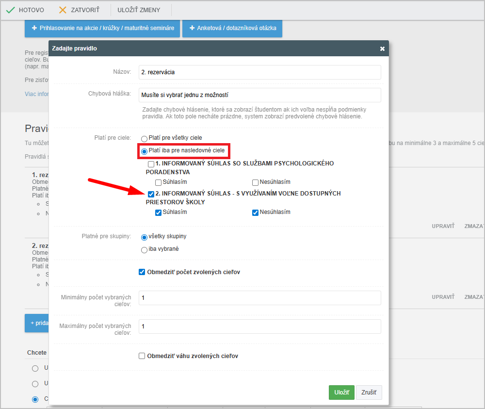 Teraz potrebujeme zariadiť to, aby rodič mohol v každom súhlase vybrať iba jednu možnosť - buď súhlasím, alebo nesúhlasím. Na to potrebujeme zadať pravidlo pre každý súhlas, tj. pre každú rezerváciu zvlášť.