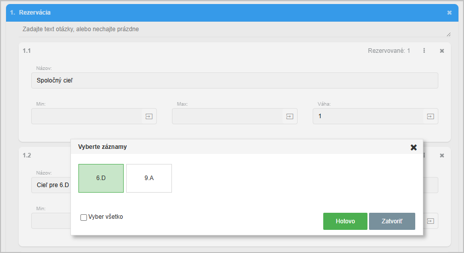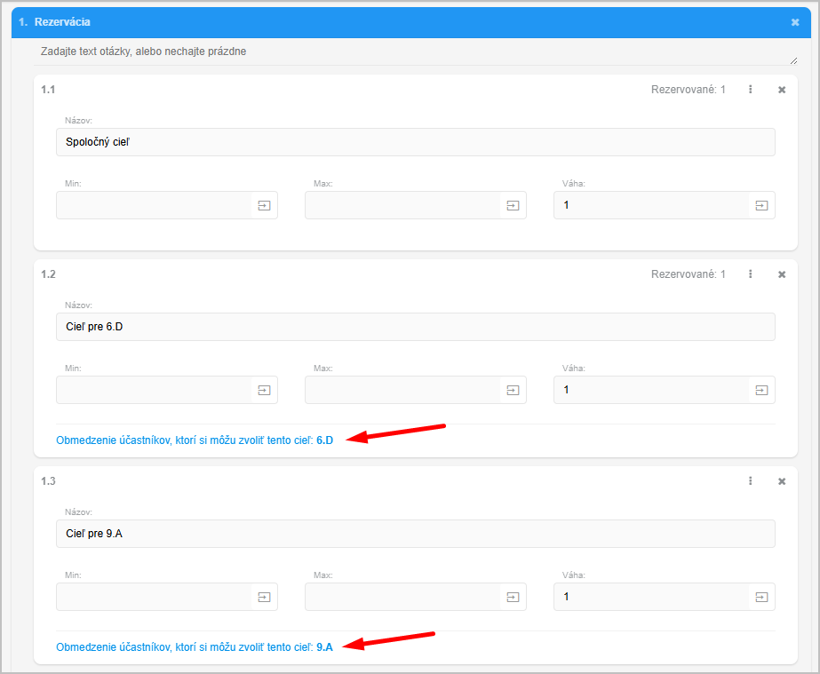 Povedzme že robíme prihlasovaciu akciu pre dve triedy 6.D a 9.A. Jeden cieľ je spoločný a druhý cieľ bude určený iba pre danú triedu.