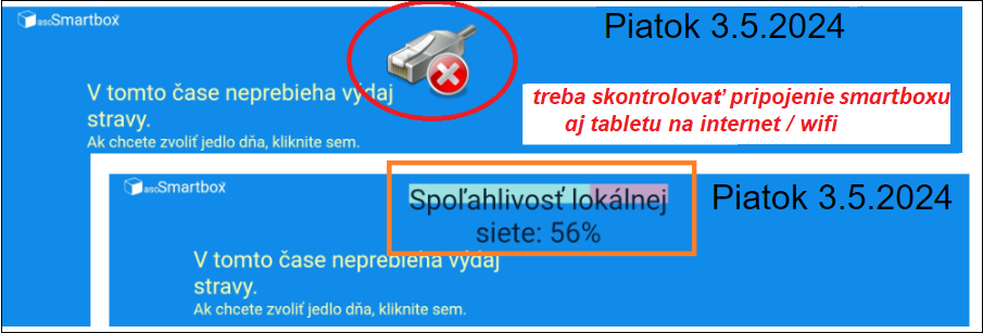 ---> ak bude políčko stále čerené, skontrolujte, či máte v jedálni funkčný internet / wifi