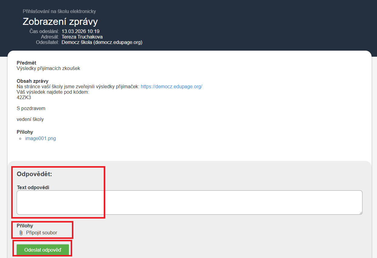 Prostredníctovom správy v EduPage alebo e-mailom uchádzač obdrží odkaz na stránku školy, kde nájde text správy vašej školy.