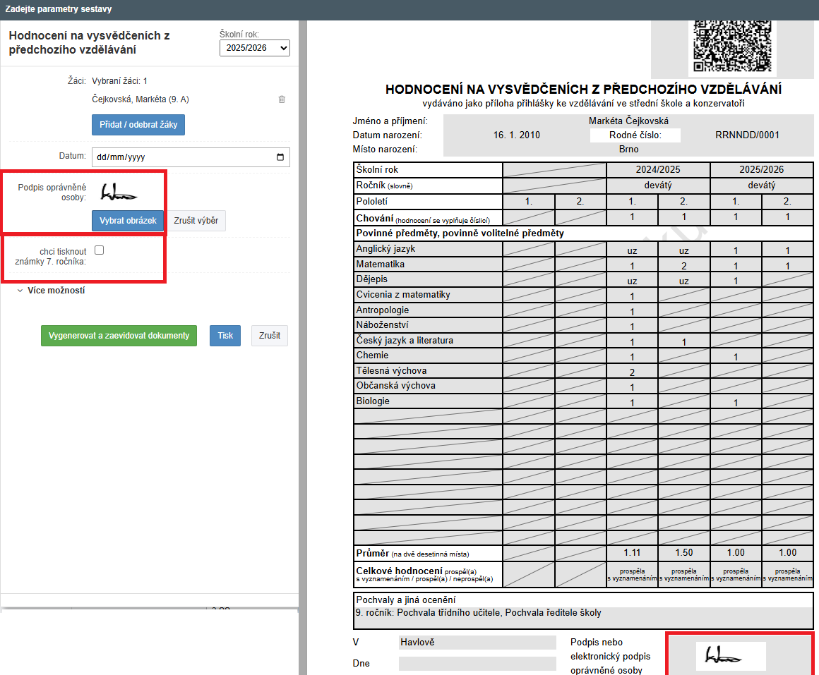 môžete takisto vybrať podpis a vygenerujete dokumenty žiakom: