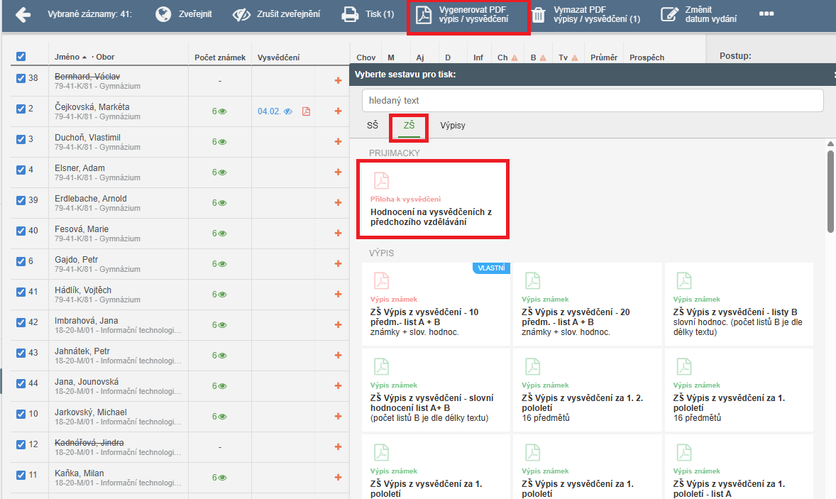 Ako vytlačiť hodnocení na vysvědčeních z předchozího vzdělávání?