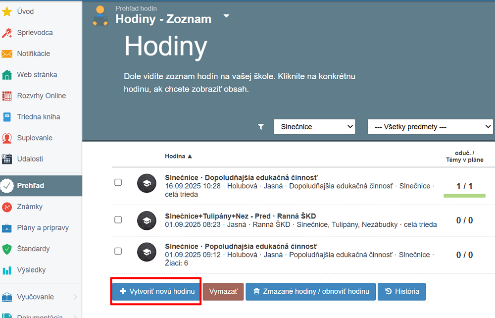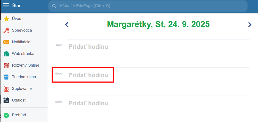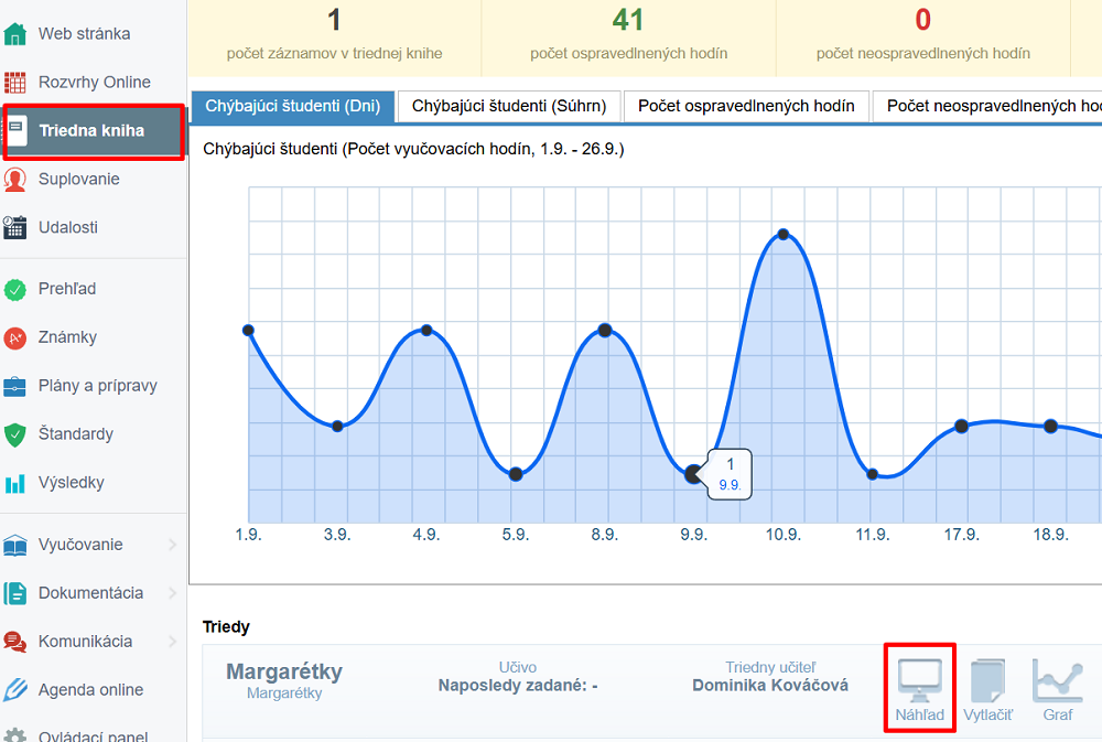 Aby bolo možné evidovať dochádzku žiakov, treba v triednej knihe pridať hodinu s aktuálnou pani učiteľkou. V Triednej knihe si vyberieme Náhľad do triedy Margarétky