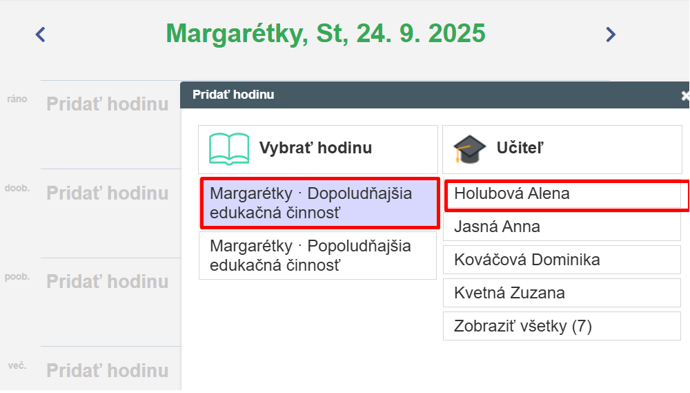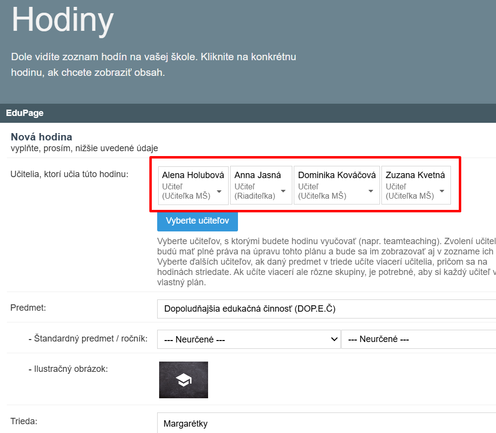 Vyberte do hodiny všetkých učiteľov, ktorí sa budú v tejto triede striedať. V našom prípade sa budú striedať 4 pani učiteľky nepravidelne v triede Margarétky. Jedna pani učiteľka dopoludnia a iná pani učiteľka popoludní.
