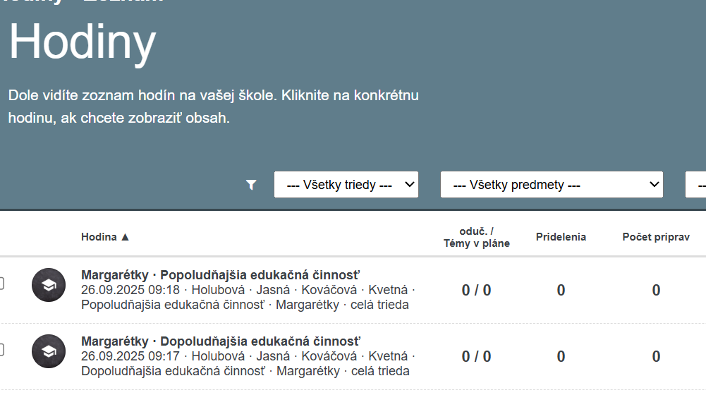 Ak sa v triede striedajú pani učiteľky nepravidelne, nebudeme hodiny zadávať do osobných rozvrhov učiteľov, ale učitelia si hodinu pridajú do triednej knihy manuálne.