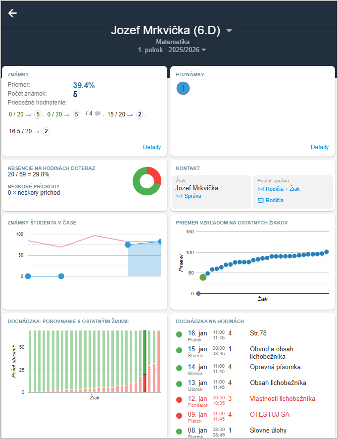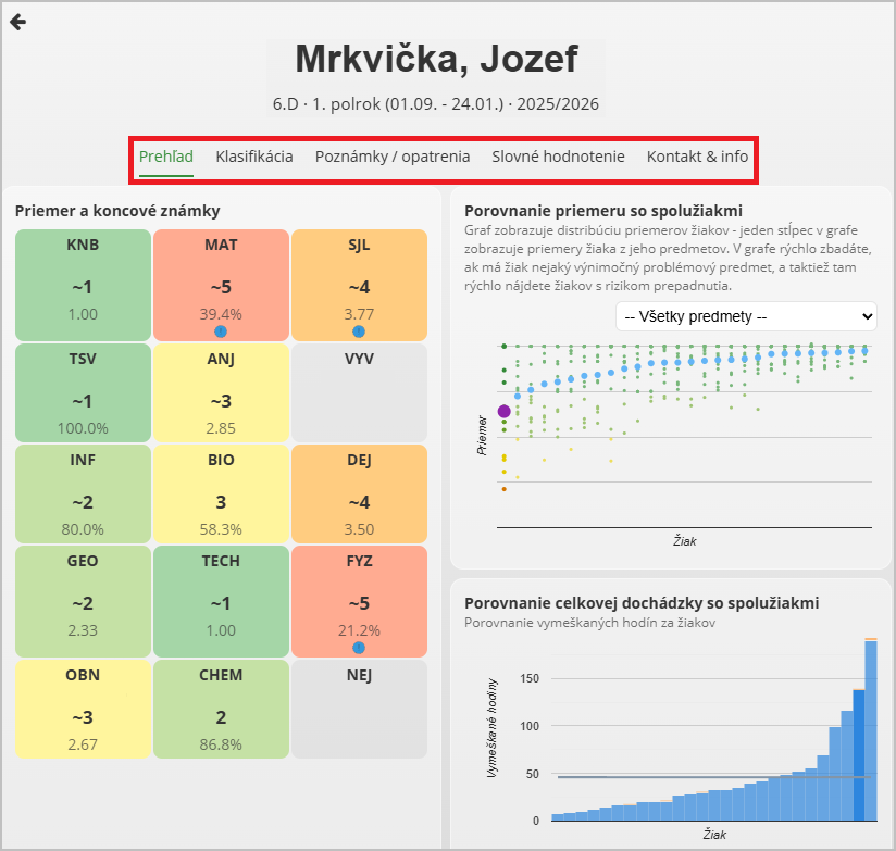 Dôležité sú aj informácie o dochádzke žiaka - koľko percent hodín z daného predmetu žiak vymeškal za dané klasifikačné obdobie.