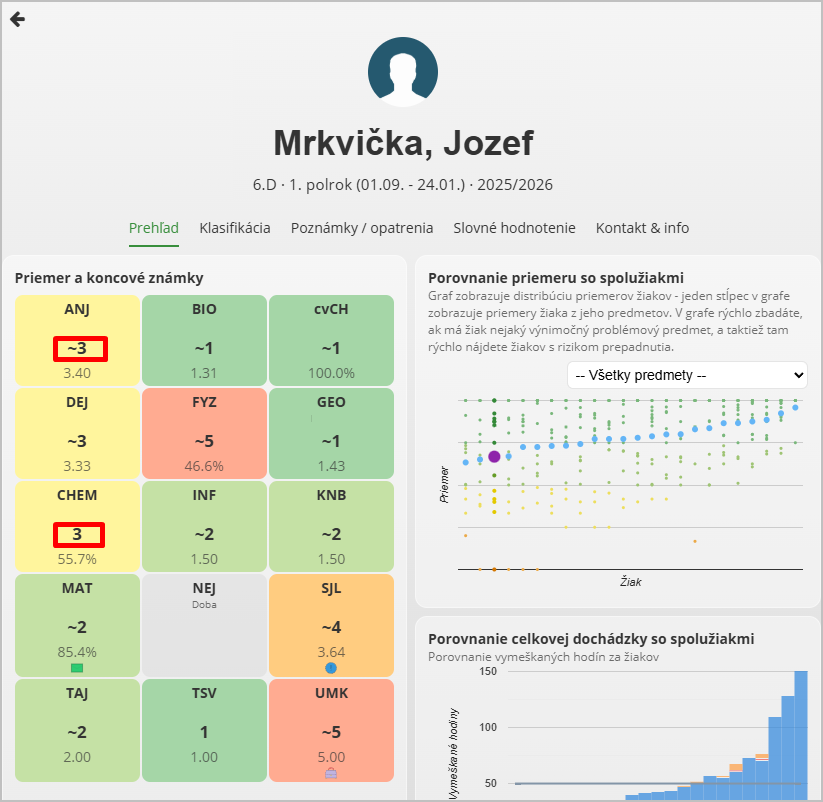 2. Pokiaľ je známka na vysvedčení zadaná, zobrazuje sa bez vlnovky - na obrázku je to napr. vyznačená známka z CHEM alebo z TSV.