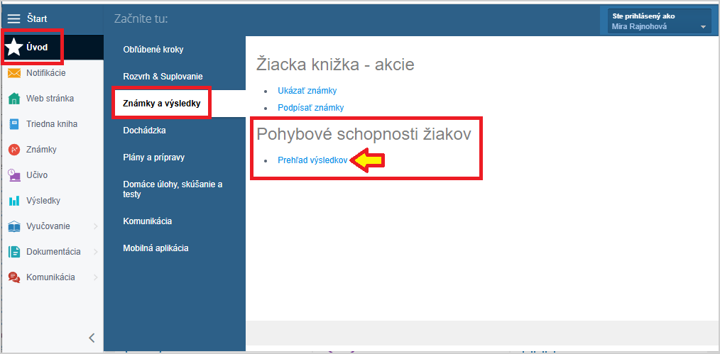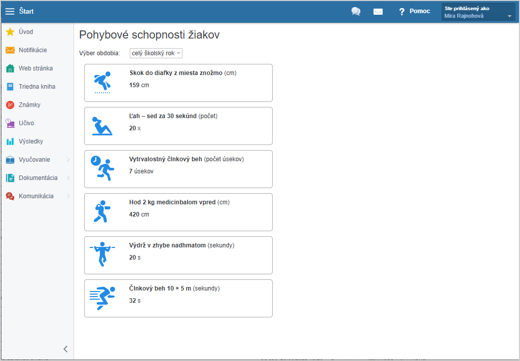 Alebo na web stránke si otvorte ponuku Štart - Známky a výsledky - Pohybové schopnosti žiakov - Prehľad výsledkov: