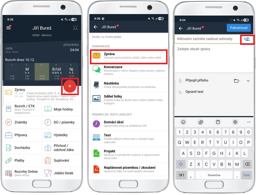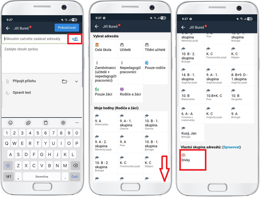 Když píšete zprávu, systém vám nabídne předdefinované skupiny adresátů – např. podle hodin.