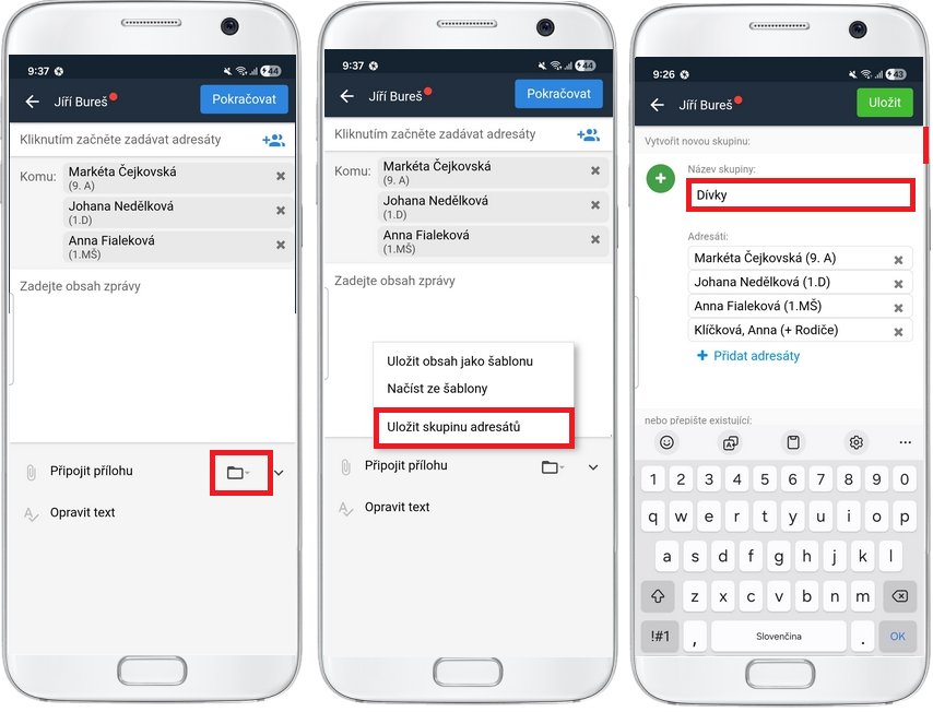 Ve spodní části je ikonu složky. Jedna z možností je Uložit skupinu adresátů. Zadejte název skupiny.