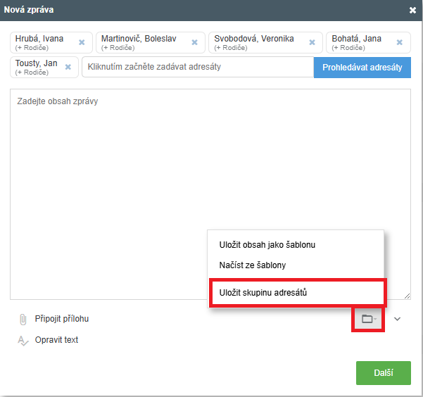 Pokud budete chtít v budoucnu poslat zprávu opět jen této skupině adresátů, klikněte na ikonu výběru, přesuňte se na konec seznamu systémem definovaných skupin. Tam se nacházejí vámi vytvořené skupiny. Kliknutím na název skupiny se vám vyberou adresáti.