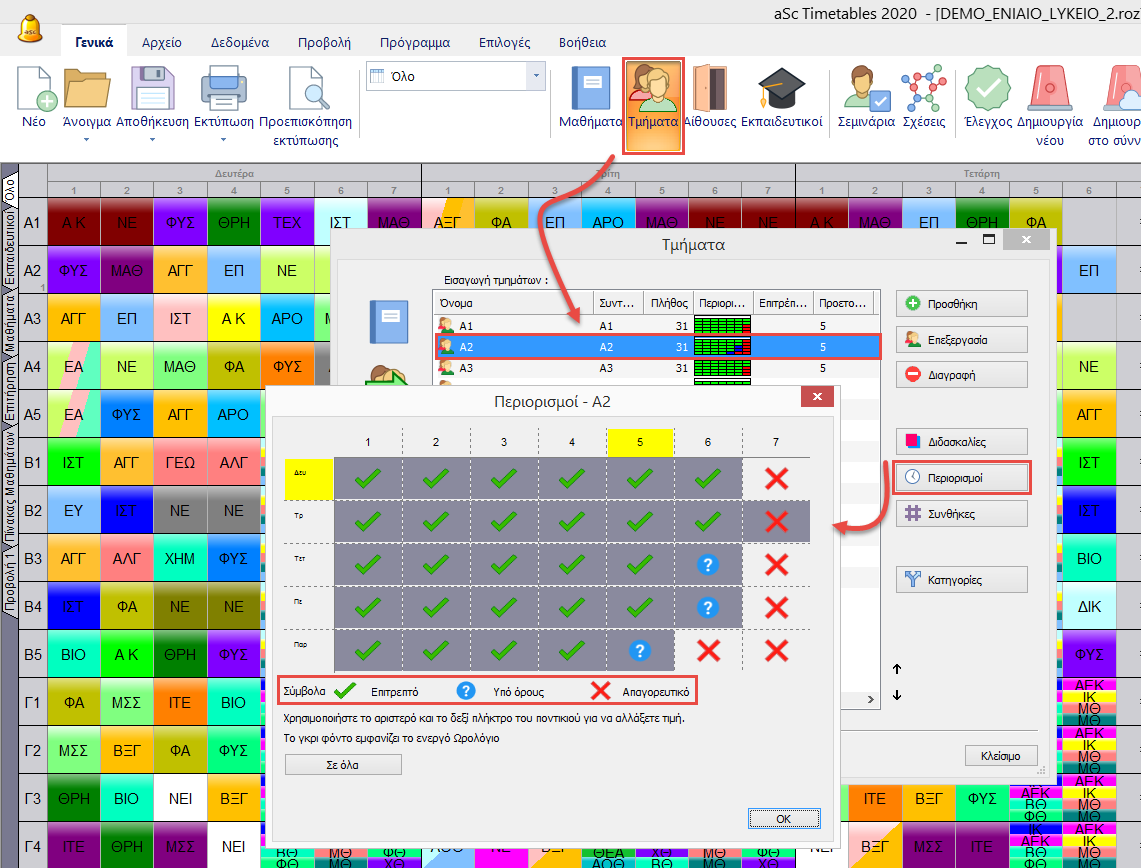 Κάνοντας κλικ στην επιλογή “Περιορισμοί” μπορείτε να καθορίσετε πότε μπορούν, πότε μπορούν να υλοποιηθούν αλλά θα προτιμούσατε να μην συμβεί αυτό και πότε δεν μπορούν να υλοποιηθούν διδασκαλίες.