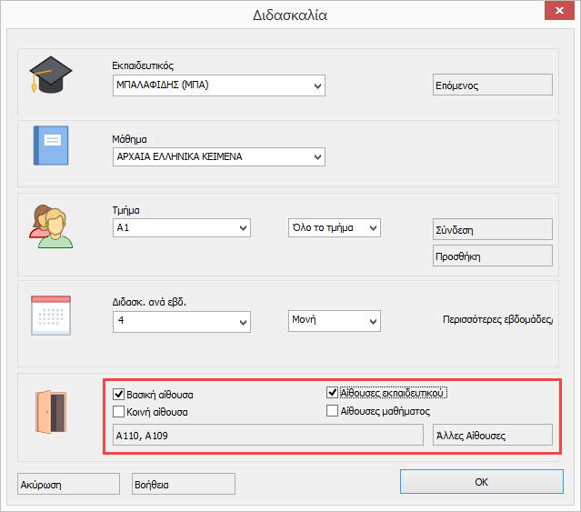 Στο τέλος κάθε διδασκαλία θα έχει τη δικιά της λίστα “διαθέσιμων αιθουσών”. Ύστερα κατά την δημιουργία του ωρολογίου θα ανατεθούν οι αίθουσες.