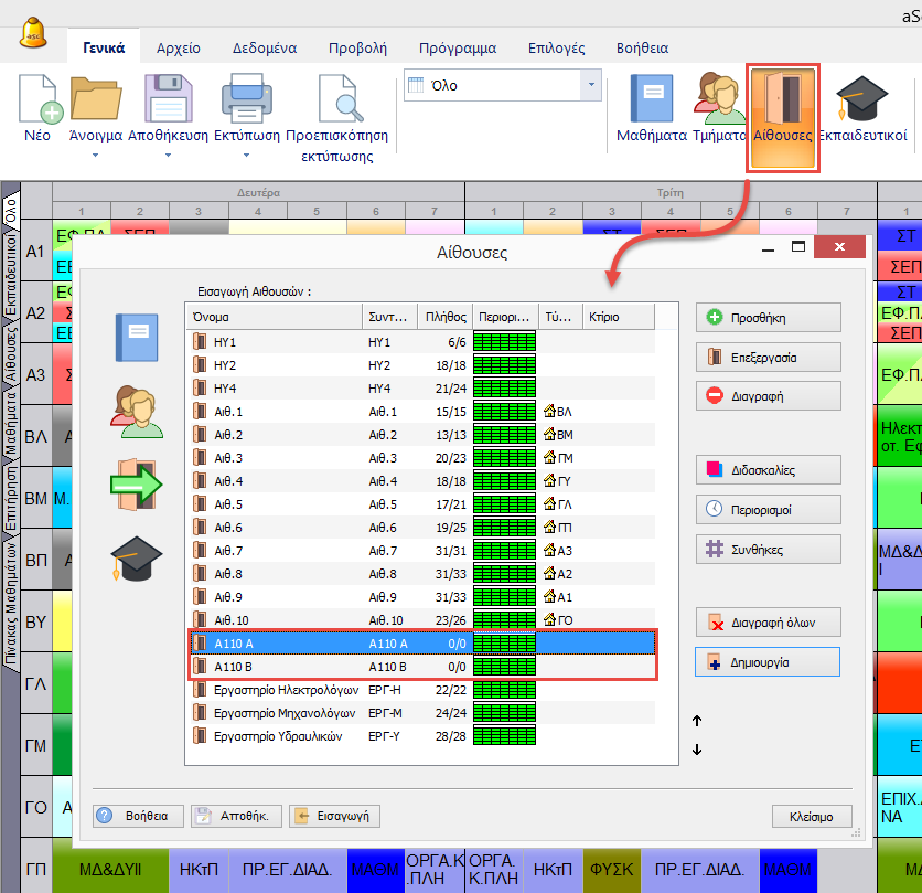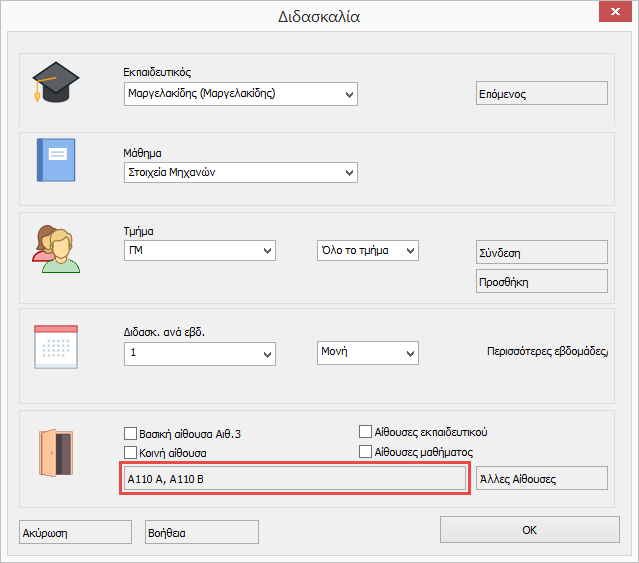 Εάν μία αίθουσα μπορεί να δεχθεί δύο διδασκαλίες ταυτόχρονα, μπορείτε να εισάγετε την ίδια αίθουσα δύο φορές.