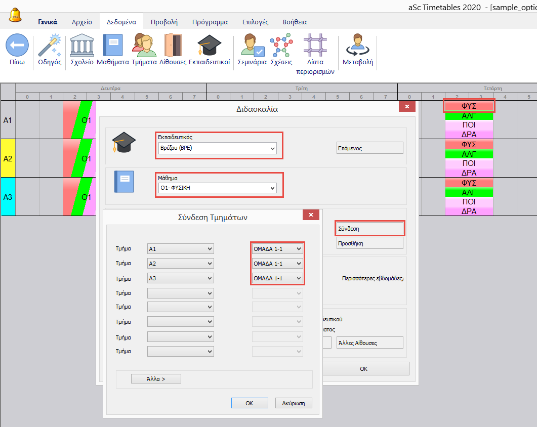 Μετά πρέπει να εισάγετε 4 διδασκαλίες για τη Επιλογή 1, μία για κάθε μάθημα που μπορεί να επιλεχθεί στην επιλογή 1. Κάθε φορά διαλέγετε έναν εκπαιδευτικό, ένα μάθημα και κάνετε σύνδεση τις 4 ομάδες από κάθε τμήμα.
