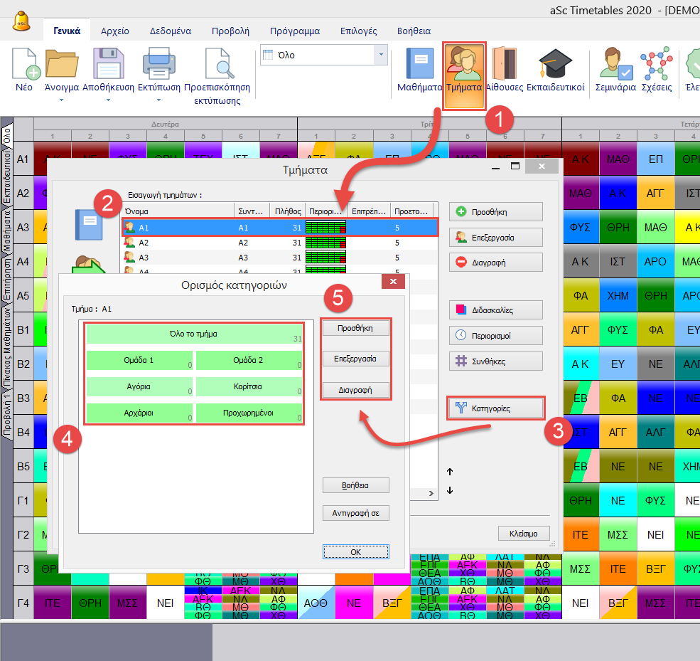 Στον παρακάτω διάλογο μπορείτε να δείτε τις κατηγορίες για ένα συγκεκριμένο τμήμα. Κάθε γραμμή αντιπροσωπεύει μία ομάδα, στη οποία εισάγουμε την ονομασία της ομάδας. Οι κατηγορίες μπορούν να αλλαχθούν χρησιμοποιώντας την επιλογή “Επεξεργασία” ή κάνοντας διπλό-κλικ στην κατηγορία.
