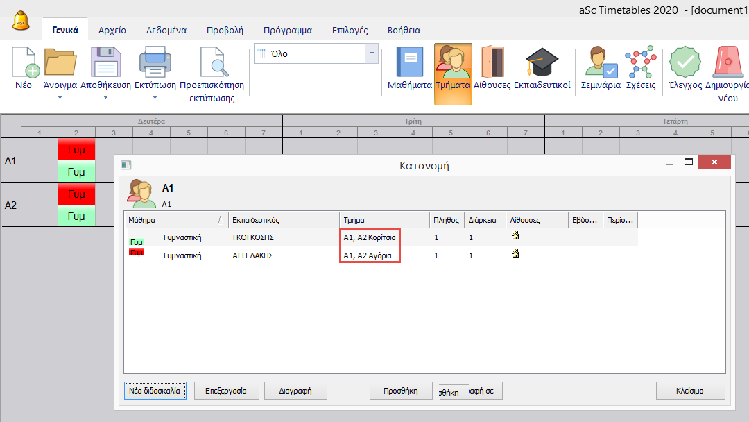 Προσοχή: Στο παράθυρο της κατανομής δείχνει μόνο τις διδασκαλίες του αντικειμένου του οποίου εξετάζουμε, άρα παραπάνω βλέπουμε μόνο τις διδασκαλίες του τμήματος Α1.