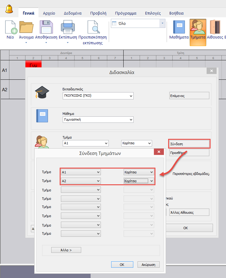 Τυπική περίπτωση: Σύνδεση μαθήματος γυμναστικής μεταξύ αγοριών και κοριτσιών δύο τμημάτων