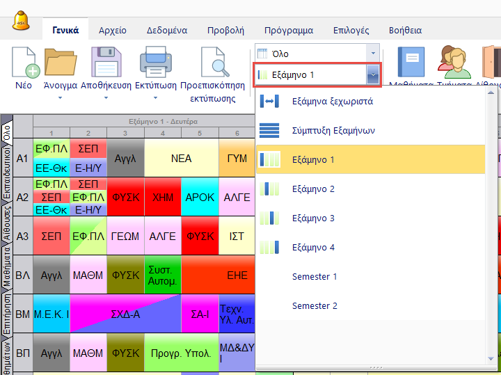 Μόλις ορίσετε ότι θέλετε να χρησιμοποιείται εξάμηνα, μπορείτε να δείτε την επιλογή εξαμήνου στην συνολική εικόνα του ωρολογίου.