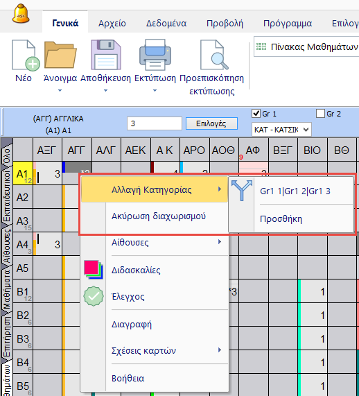 1. Επιλέξτε το μάθημα και το τμήμα κάνοντας κλικ στο αντίστοιχο κελί. Πληκτρολογήστε 3 για το πλήθος των διδασκαλιών ανά εβδομάδα. Μετά κάντε δεξί-κλικ στην διδασκαλία και επιλέξτε την Κατηγορία.