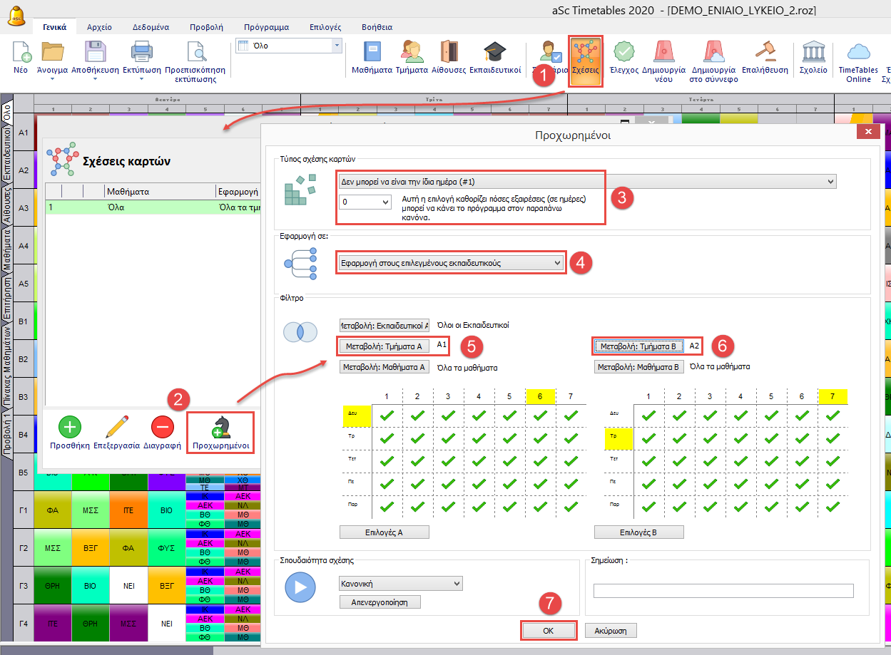 Μπορείτε να προσθέσετε μία σχέση που θα ορίζει ότι, ο εκπαιδευτικός δεν μπορεί να διδάξει σε δύο τμήματα την ίδια μέρα.
