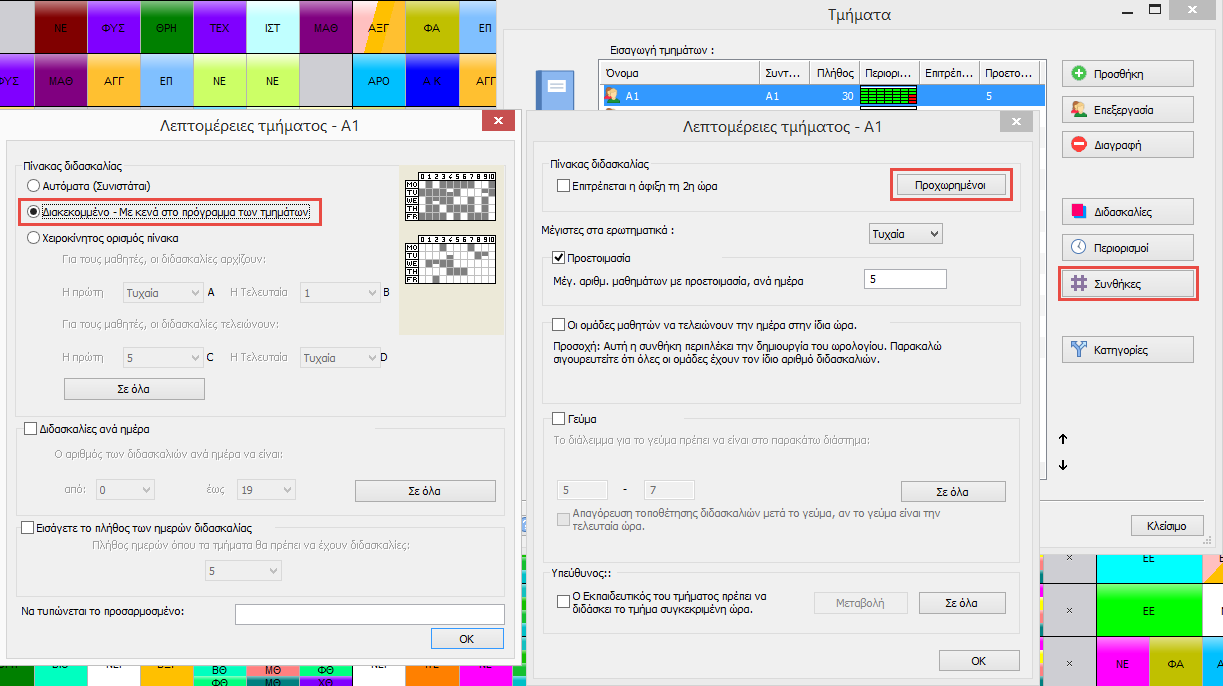 Από προεπιλογή το πρόγραμμα προσπαθεί να δημιουργήσει ωρολόγιο για κάθε τμήμα που να ξεκινάει την 1η περίοδο. Επίσης υπολογίζει τον μέσο όρο περιόδων κάθε μέρα και προσπαθεί να ισορροπήσει τις διδασκαλίες ανά ημέρα.
