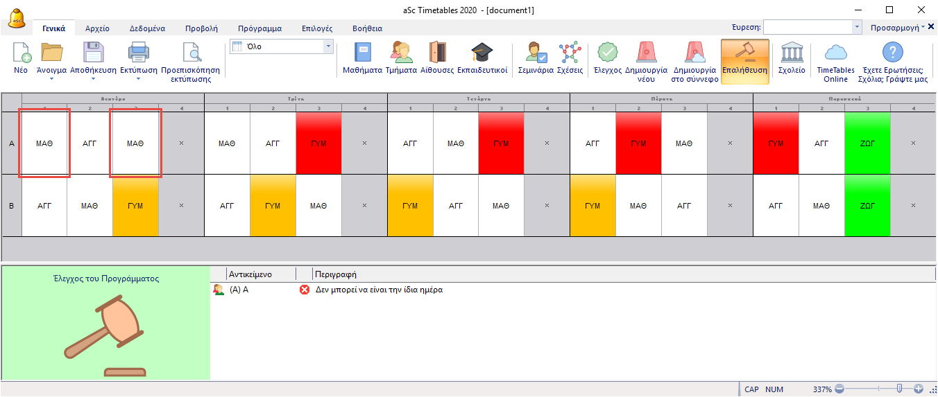 Σε αυτήν την περίπτωση προσπαθήστε να ανοίξετε τις περιόδους των εκπαιδευτικών που δεν είναι απαραίτητο να είναι κλειστές και επιτρέψτε στο πρόγραμμα να τοποθετεί δύο περιόδους από το ίδιο μάθημα την ίδια μέρα.