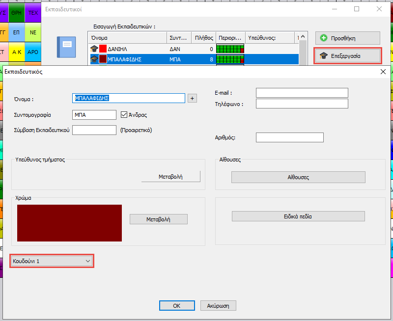 Μπορείτε να ορίσετε ποια κουδούνια θα εκτυπωθούν για κάθε εκπαιδευτικό με τον παρακάτω τρόπο.