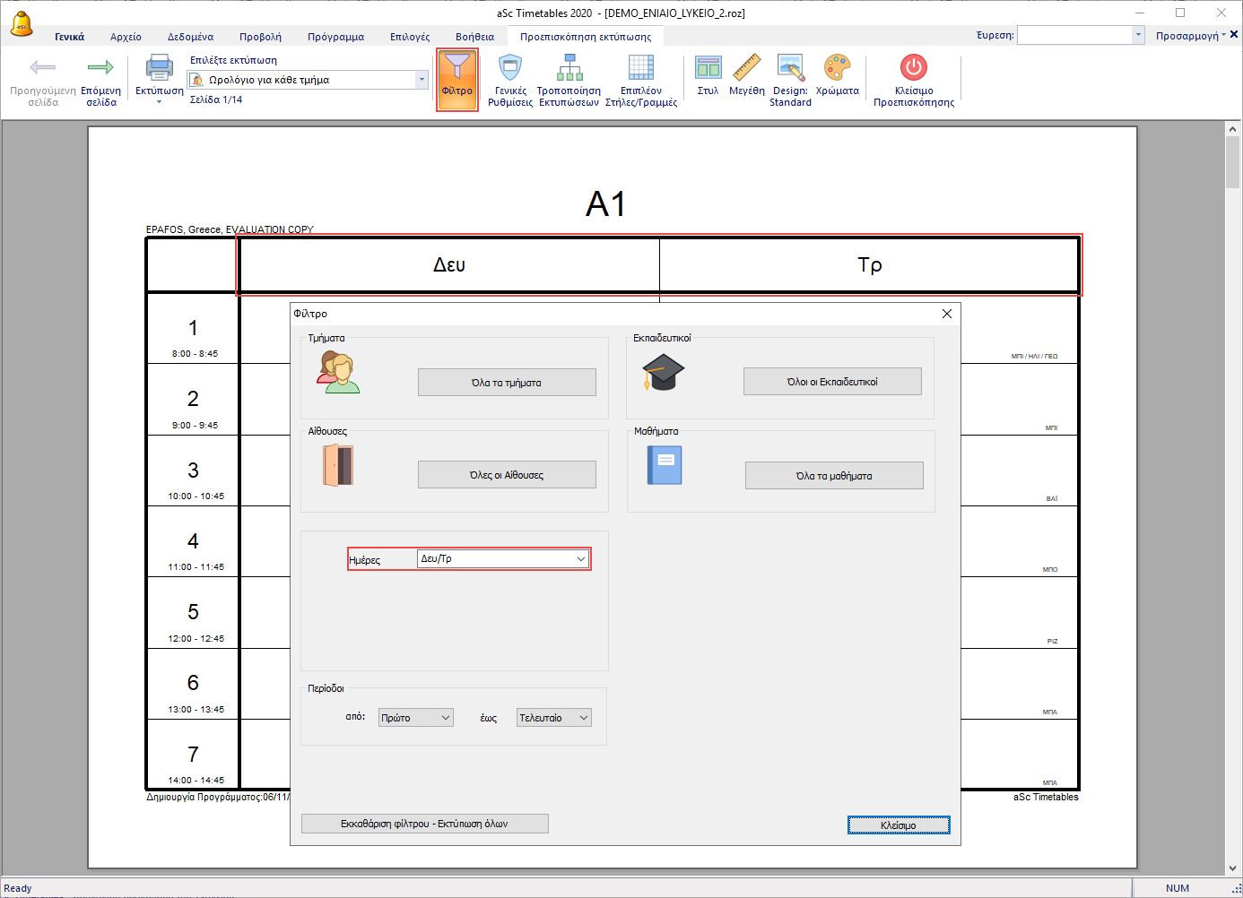 Πως θα εκτυπώσω μόνο το πρόγραμμα από την Δευτέρα και την Τρίτη;